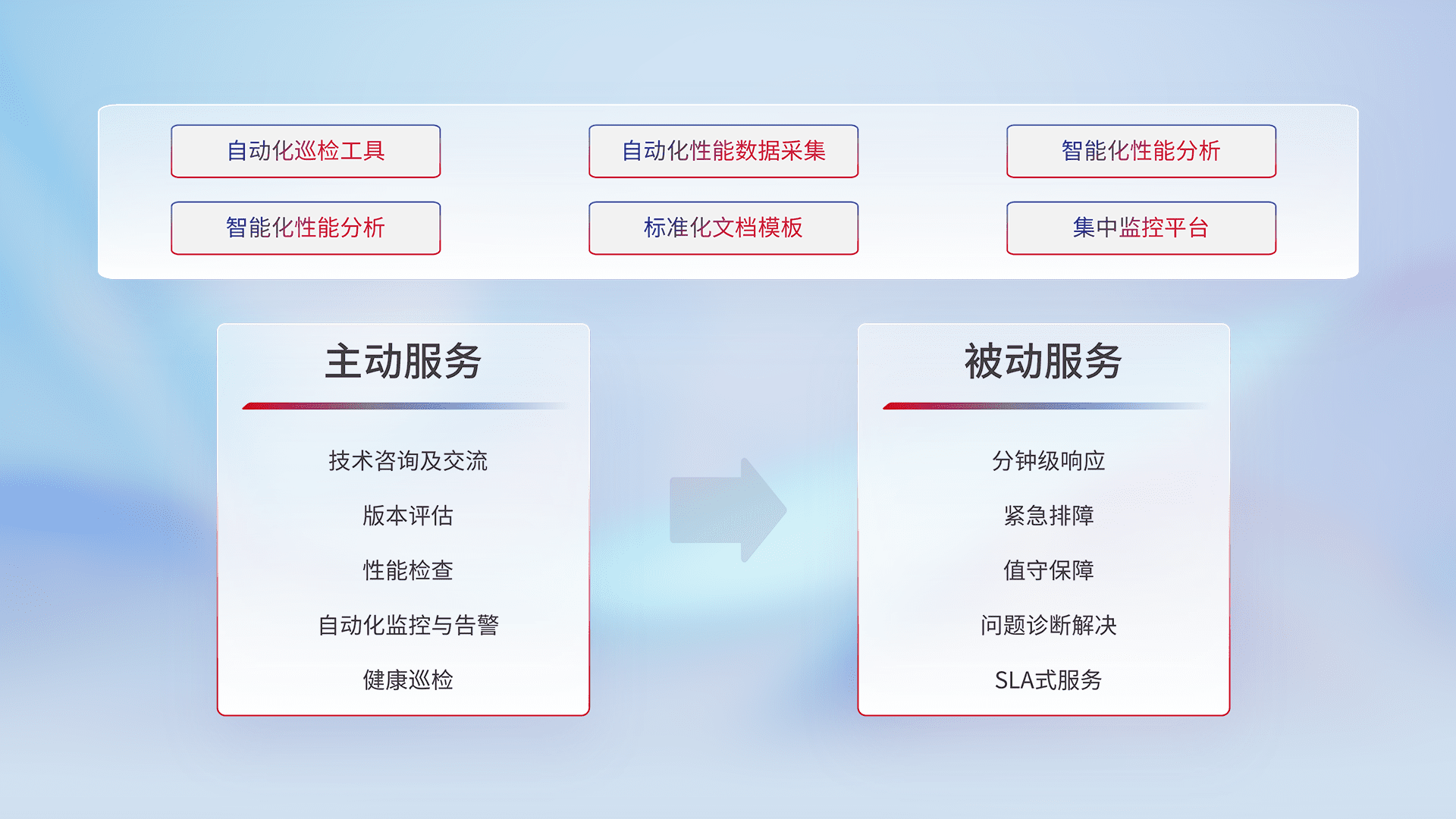 智能化工具和标准化文档,,,保障服务质量,,,提供主动服务(包含技术咨询、、、、版本评估、、、性能检查、、、、自动化监控与告警、、、、健康巡检)和被动服务包含(分钟级响应、、、、紧急排障、、、、值守保障、、问题诊断解决、、、、SLA服务)。。
